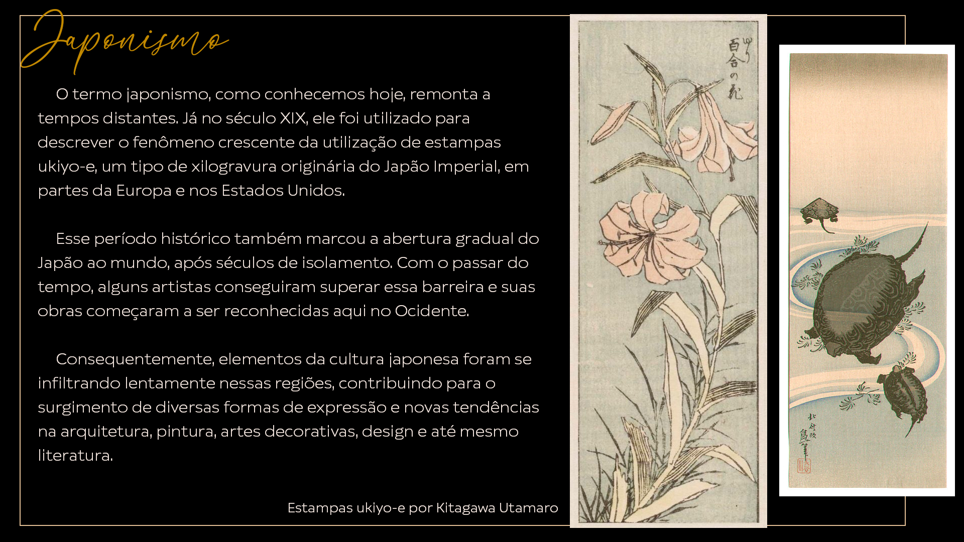 Consequently, elements of Japanese culture slowly infiltrated these regions, contributing to the emergence of various forms of expression and new trends in architecture, painting, decorative arts, design, and even literature. Ukiyo-e prints by Kitagawa Utamaro are notable examples.